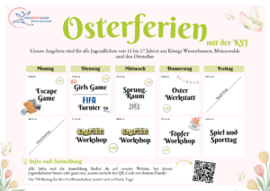 Unser Programm für die Osterferien ist ONLINE und wartet auf eure Anmeldungen. Seid schnell und sichert euch euren Platz im Ferienprogramm und in unseren Angeboten.